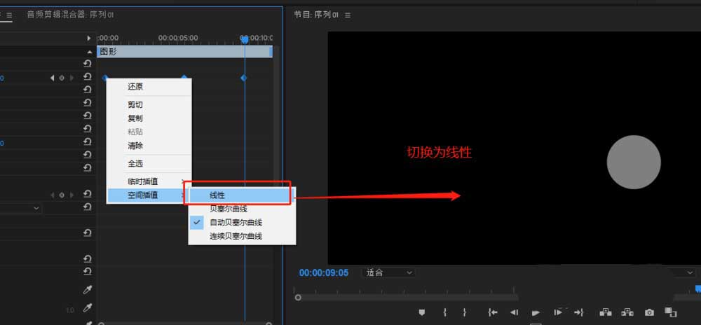 5、再次右键打开关键帧空间插值切换选项,这里我们切换选择“线性”,以这个线性效果切换为例。
