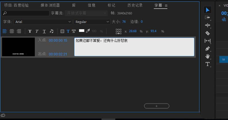 6、找到需要添加字幕的时间点,打开字幕窗口,直接输入字幕内容,并且可以在字幕窗口编辑输入字幕文字的相关参数。这样就得到了一个开放式字幕。