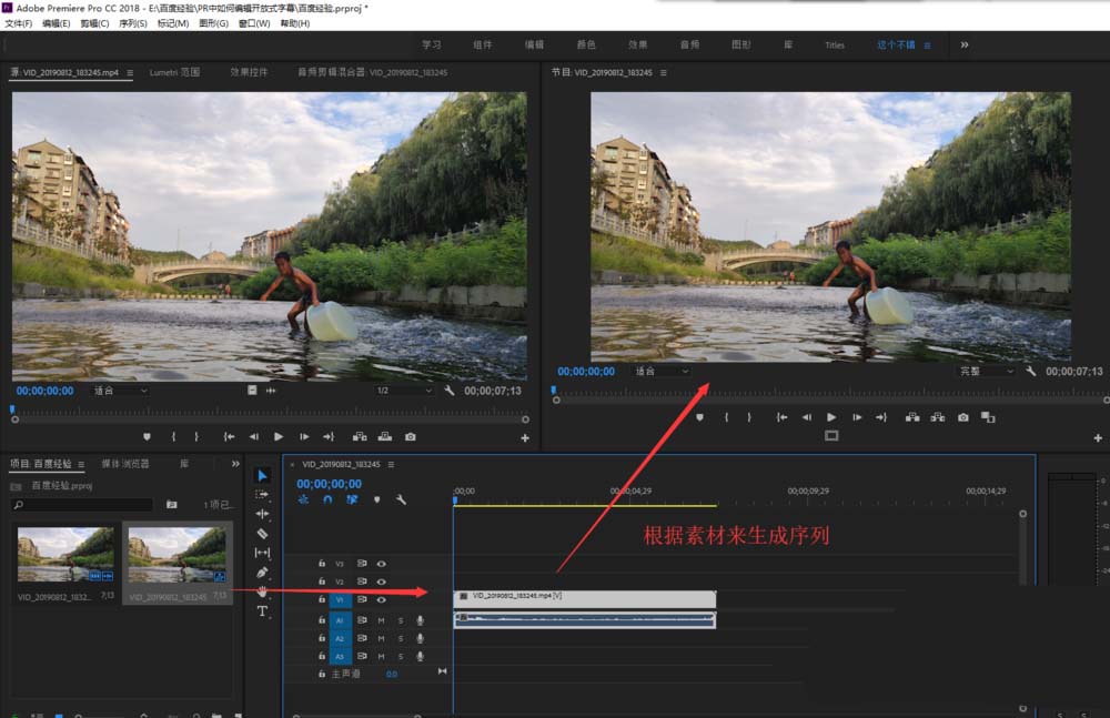 2、执行导入之后,选择视频素材媒体导入到PR中,然后根据这个导入的视频素材媒体来生成一个剪辑序列。