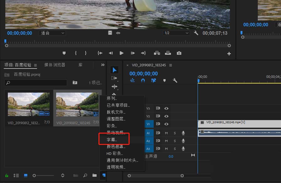 3、在PR项目管理窗口找到“新建”按钮,选择新建中的字幕选项。