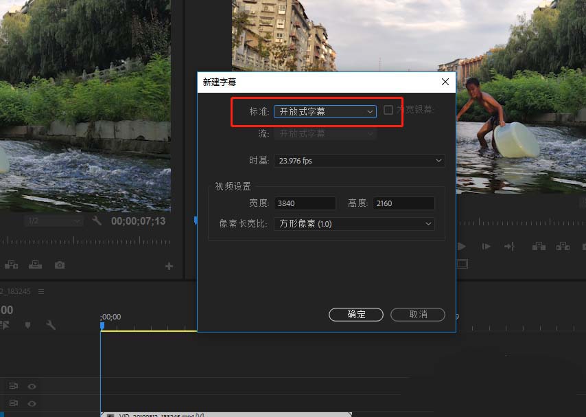 4、会弹出新建字幕的对话窗口,在新建字幕的对话窗口中选择标准为“开放式字幕”,其他参数保持默认即可。单击确定。