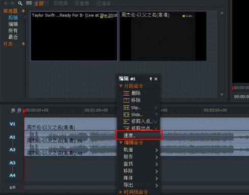 2、慢动作其实是将视频的整体节奏放慢,如果你想要添加慢动作,则只需要右键点击时间轴下方的视频,选择其中的“速度”选项,如下图所示: