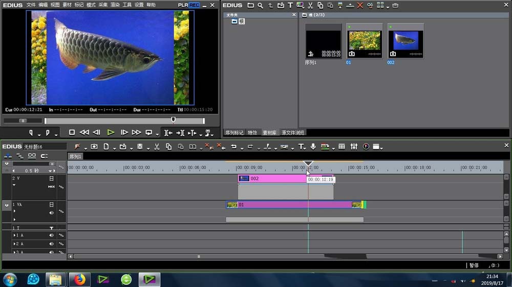 3、将这两段素材导入到上下两层的时间线上,相互叠加