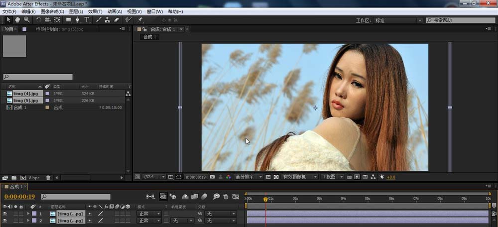 1、首先就是素材的导入,这个导入的方法很简单,不再赘述,将素材库的素材拉至合成里面的时间线上