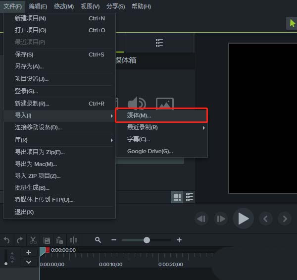 1、通过Camtasia 9软件来生成一个项目,在这个生成的项目中执行文件菜单中的导入命令,选择导入中的媒体选项。