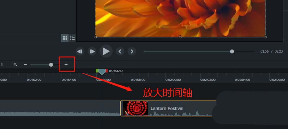 4、因为上一步中两个素材时间轴长度比较小,所以点击那个加号“+”放大时间轴。