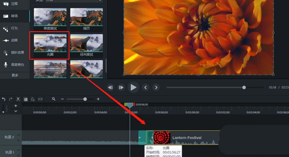 5、在Camtasia 9转场选项中找到“光圈”效果转场,选择光圈效果转场给轨道中两个视频素材添加,添加到这两个视频媒体中间。