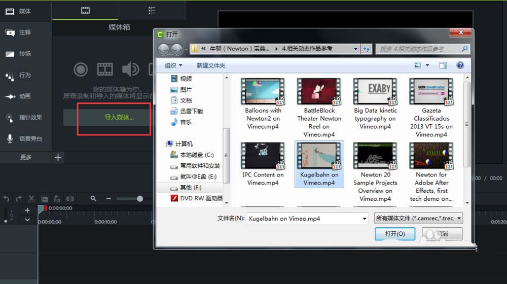 2、在新建项目中找到媒体,单击导入媒体选项,会弹出一个“打开”对话窗口。导入媒体。