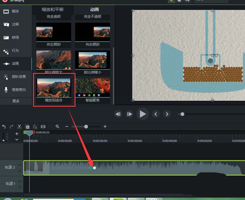 4、选择动画页面,在动画中找到“缩放到合适”这个动画效果,将这个缩放到合适动画移到轨道媒体文件上。