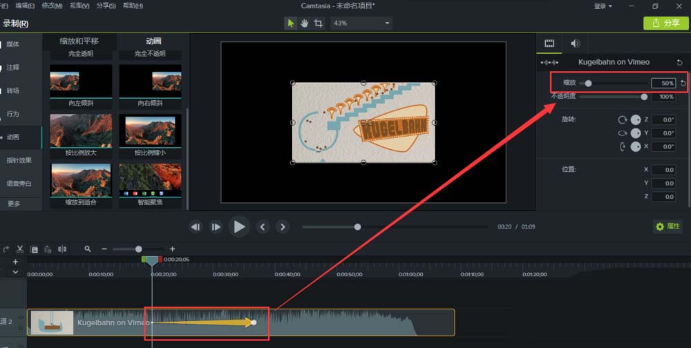 5、在轨道媒体上调整缩放到合适动画的时长,单击动画的开始,在属性中设置缩放的数值,这里我设置的是50%。