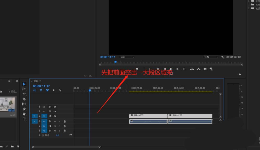 3、在选中位于后面位置的视频素材,将其拖动到前面的空轨道位置上,与最前面的贴齐。