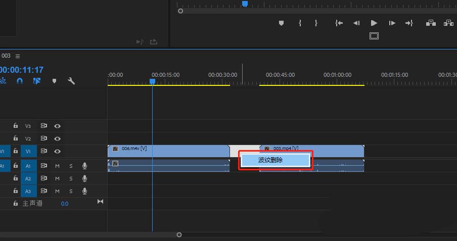 4、在两段视频的中间空出的位置上右键鼠标,会出现一个“波纹删除”的命令,点击删除波纹。