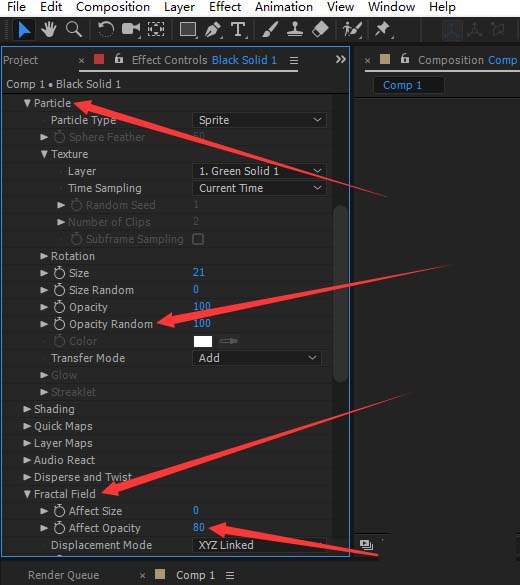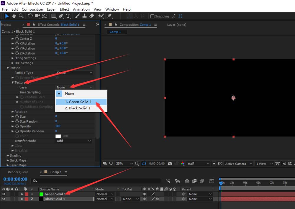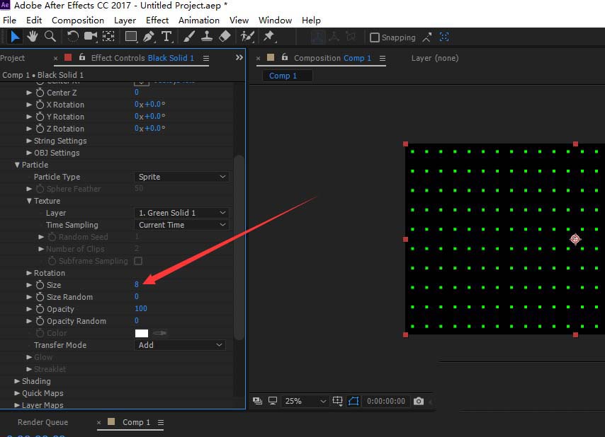 6、调节粒子样式,替换成新建的比较小的固态层。