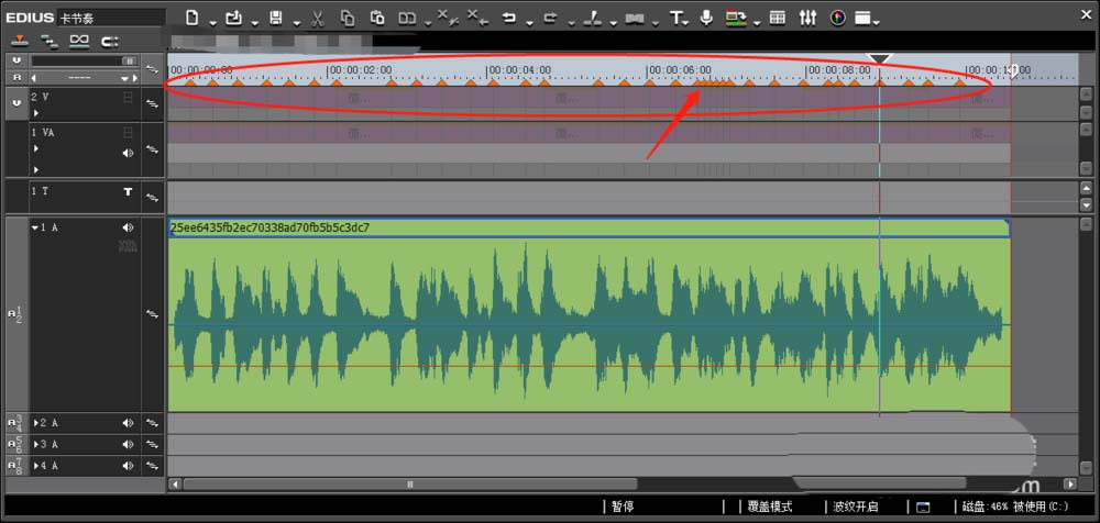 2、第一步我们将音乐素材导入edius,拖入音频轨道