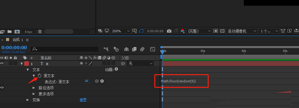 3、按住ALT键的同时点击鼠标左键,点击源文本旁边的小闹钟,在表达式的那一行上输入表达式:Math.floor(random(9))