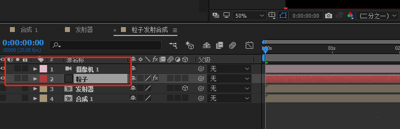 2、新建一个合成,名为【 粒子发射合成】,尺寸为1920X1080 ,把刚才新建的两个合成拖到这个新建的合成里面。关闭两个合成的显示眼睛,打开【发射器】图层的三维开关