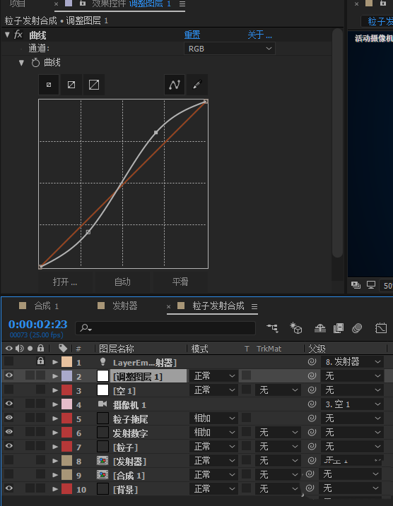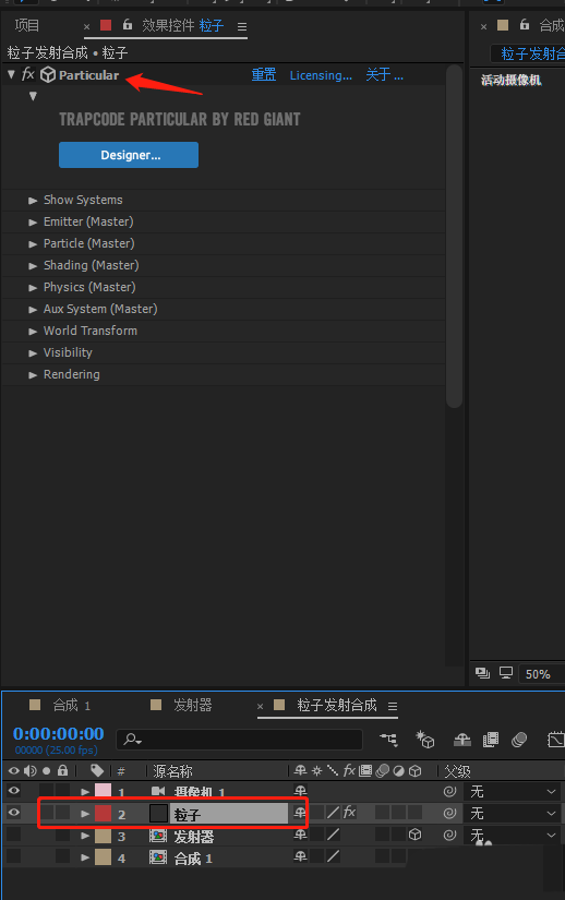 3、新建一个摄像机和一个名为 粒子的图层,在粒子的图层上添加效果 particular