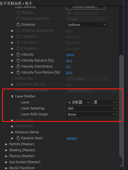 4、在粒子插件的 发射方式选项上选择 Emitter Type>Layer,然后在图层发射器选项上选择 Layer > 4.发射器;Layer RGB Usage 选择 None