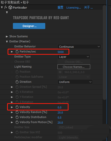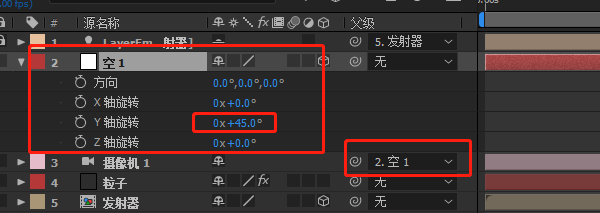 5、把粒子发射数量Particles/sec增大【数值可以自定义】,把速度Velocity改为0。新建【空1】图层,打开三维图标,把摄像机绑定到图层【空1】,把【空1】图层Y轴旋转改为45度