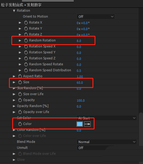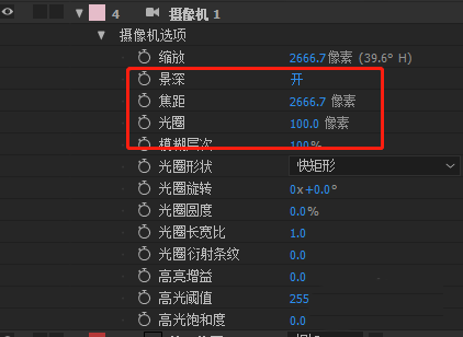 2、把【粒子拖尾】【发射数字】图层模式改为相加。回到【粒子】图层,把Particles/sec=40000,数值改高点;把粒子颜色改为蓝色;把摄像机的景深打开,调节一下参数,如图