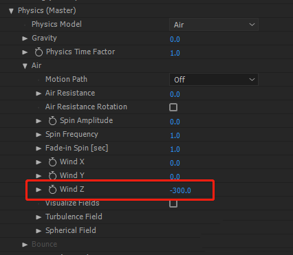 在Physics>Air>Wind Z ,把Z轴的数值改为-300