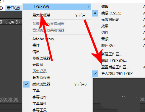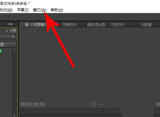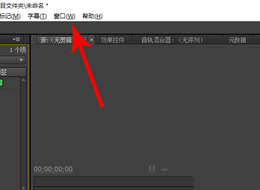 1、发现时间轴面板消失时点击pr菜单栏中的“窗口”
