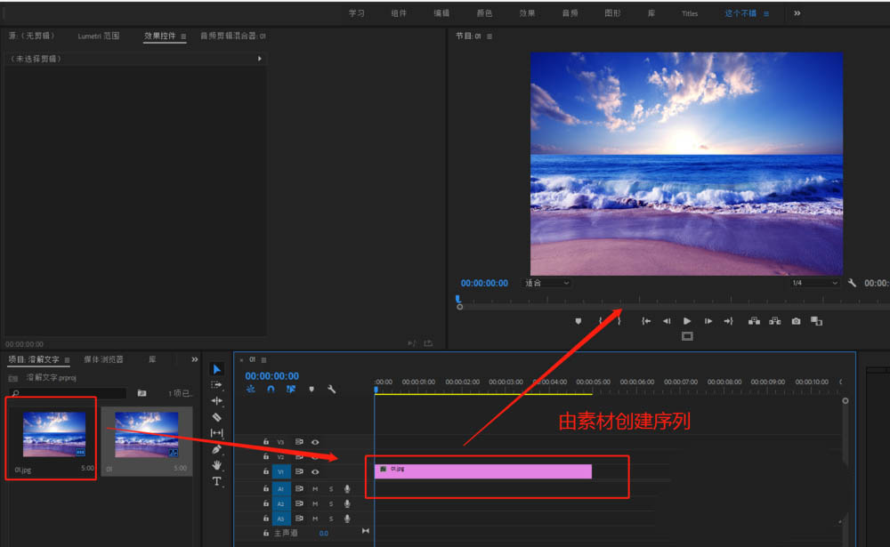 2、选中导入的素材,拖到时间轴窗口单击,让PR根据素材来创建一个序列。