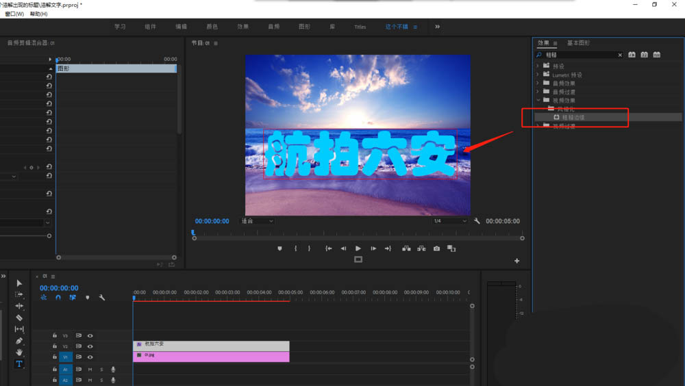 4、显示效果窗口,在效果窗口中搜索找到“粗糙边缘”这个PR内置效果,将这个效果添加给标题文字。