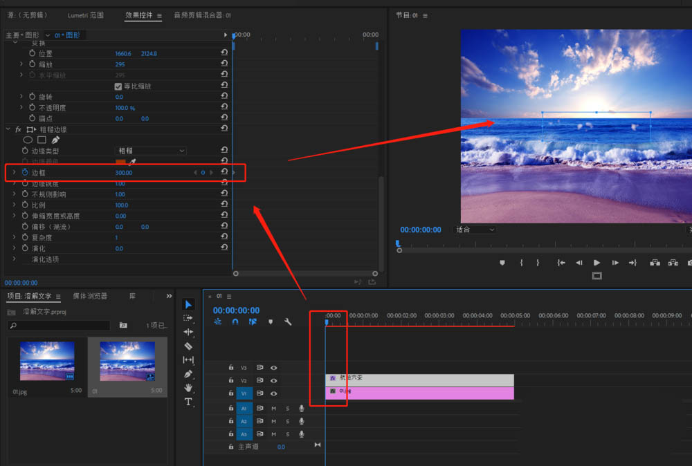 5、打开标题文字的效果控件设置,找到粗糙边缘,在边框上打入第一个关键帧,设置数值为300.然后隔一段时间,在将边框的数值改为0并自动生成一个关键帧。