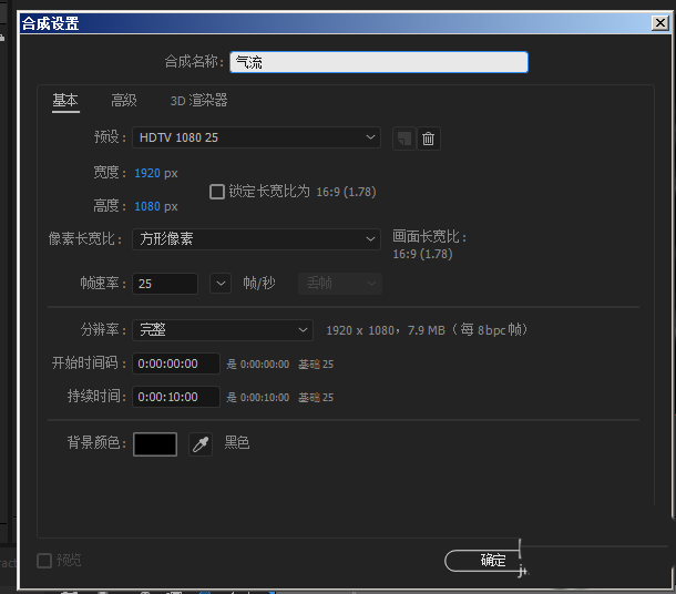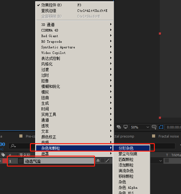 1、新建合成,名为气流。在此合成里新建纯色黑色的固态层,名为动态气流,为此固态层添加效果-杂色和颗粒-分形杂色。