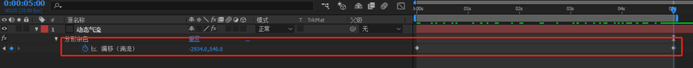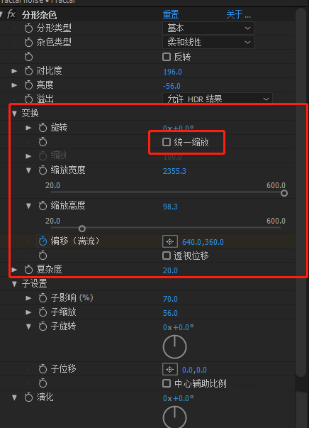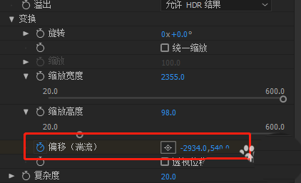 3、设置变换动画:取消统一缩放的勾选;缩放宽度=2355;缩放高度=98;为偏移(湍流)K动画,点击偏移(湍流)旁边的小闹钟:在第一秒设置数值为【640,360】,在第五秒(这个时间长度根据动画所需调整)设置【-2934,360】