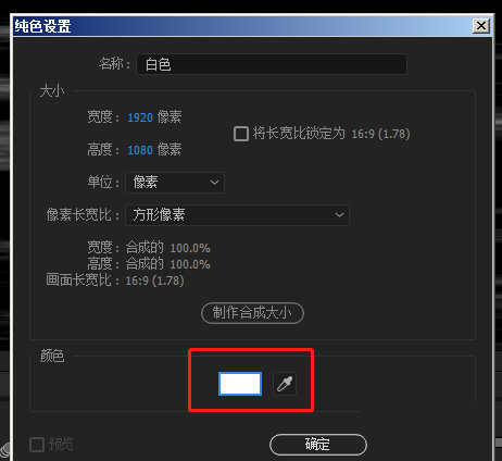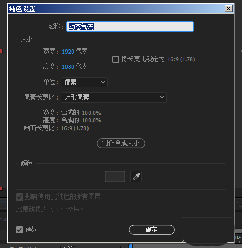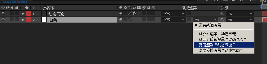 1、新建一层纯色为 白色,把颜色改为白色(如图),这层白色就是为了去掉动态气流图层的黑色。把白色图层拖到动态气流图层下面,在TrkMat 选项选择【亮度遮罩】;