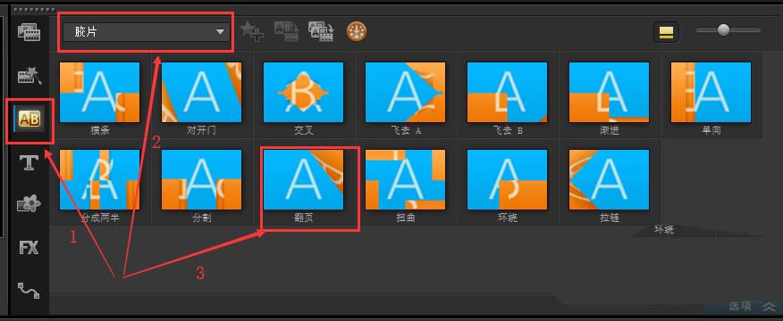 4、然后点击转场这个选项,然后点击选择到胶片、最后选择翻页这个选项。