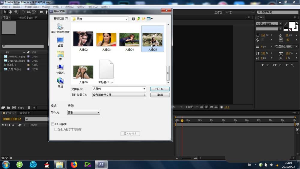 1、最首要的步骤就是图片素材的素材库导入,导进去之后再导入合成里面的时间线上