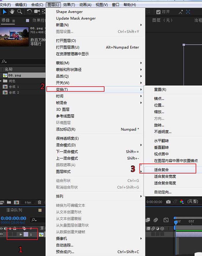 5、可以看到图片与合成大小不一致,选中图片,然后在菜单里选择如下选项:
