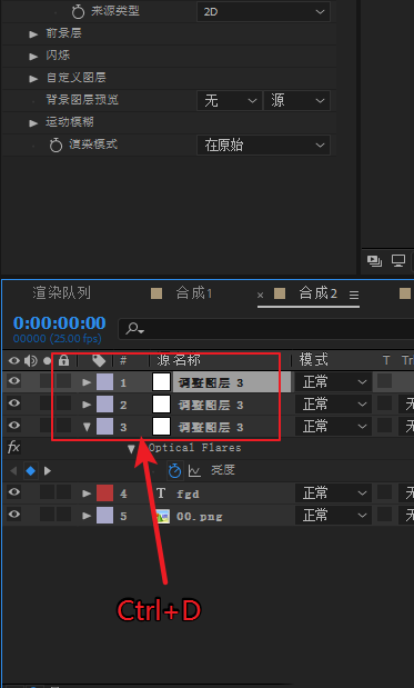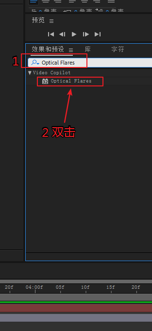 2、选中调整图层,在效果和预设面板里搜索Optical Flares,然后双击Optical Flares,就将效果添加到调整图层上了。