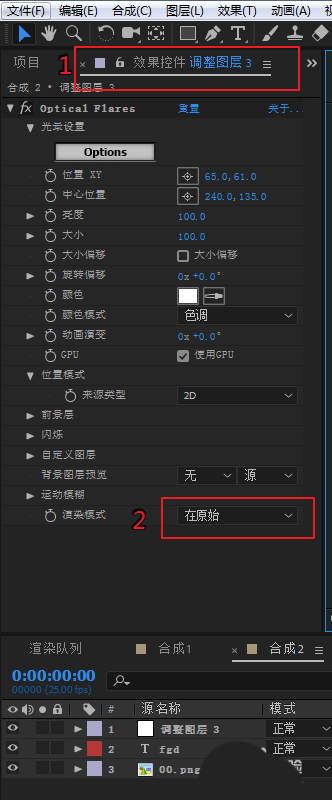4、切换到效果控件面板,将渲染模式改为“在原始”。这样黑色的背景就消失了,只添加了光晕效果。
