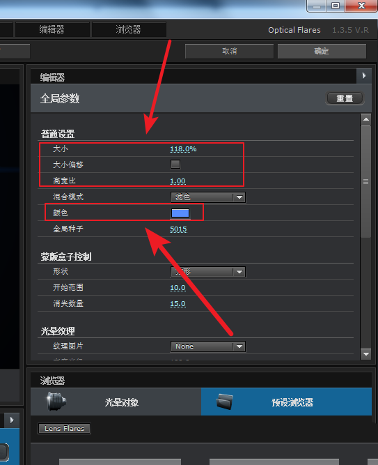 7、添加好预设后,还可以对光晕的大小、长宽比和颜色进行调整,这里保持默认。