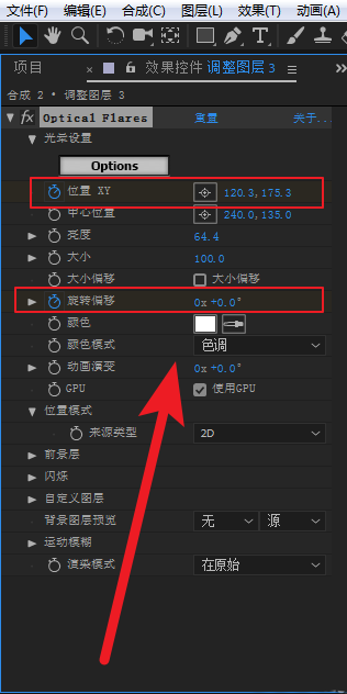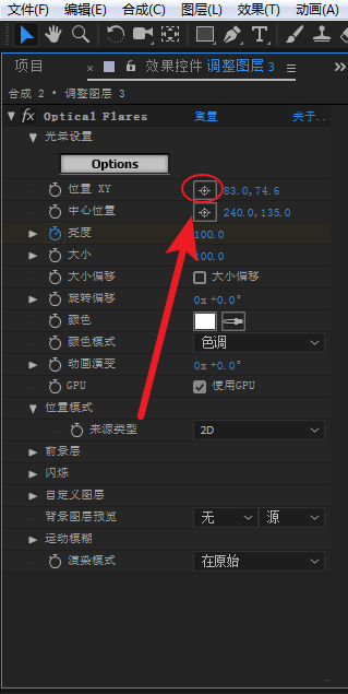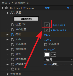 2、选中调整图层,在效果控件面板的Optical Flares属性选项下,点击选择位置XY旁边的十字图标,然后在预览窗口中选择一个位置,这时屏幕出现了十字坐标,选择一个位置点击一下,光晕就定位到这个位置上了。比如定位到轮胎的位置。