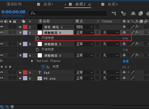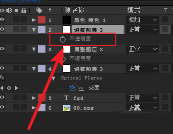 3、如果想要降低光效动画整体的发光亮度,可以选中调整图层,按T键,展开透明度,将透明度减小就可以了。