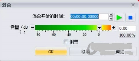 4、在选中原文件后,选择“编辑——混合”,弹出混合窗口,选择混音开始的时间,比如“00:00:05.00000”就是在音频的第5秒添加水印。并选择音量,建议尽量将声音调低,防止影响到原文件的效果。