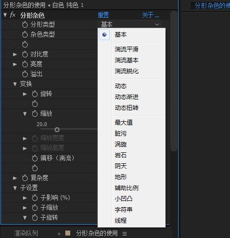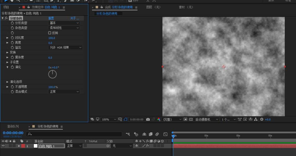 演化:在分形杂色比较常用的第二个关键帧动画之一,应用这个属性之后,分形杂色的黑白信息将会发生演变,澡波不断的变化;