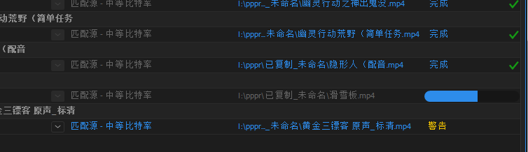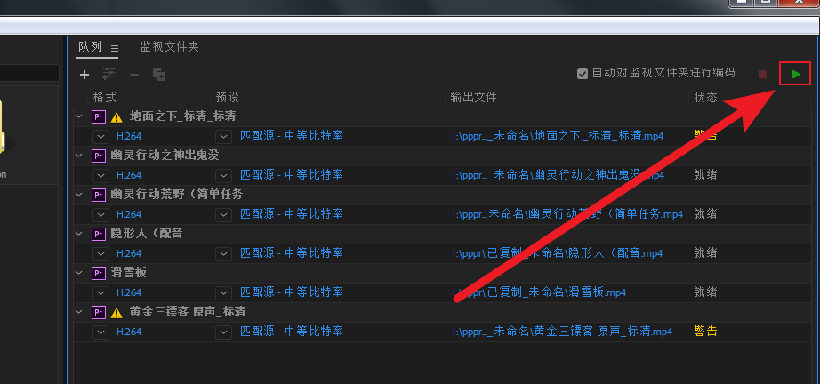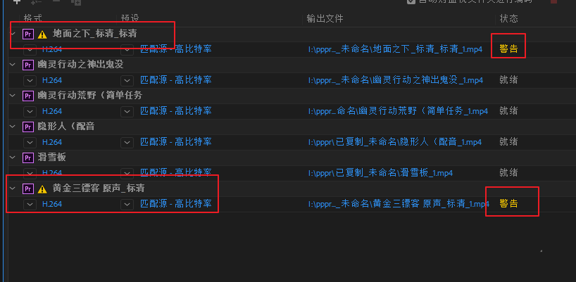 7、有时从PR导出ME时,会发现部分视频弹出黄色叹号警告。这是由于源元素的编码、尺寸比、帧率等问题造成的。解决办法,对个别不识别的素材,在ME批量渲染导出后用PR单独渲染。
