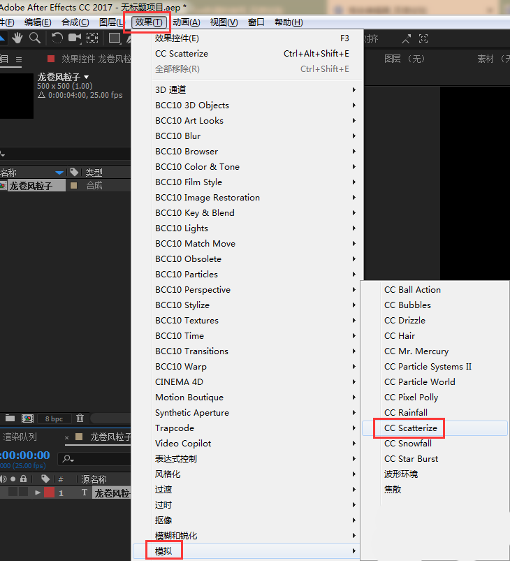 3、选中文字图层,添加CC Scatterize效果;效果-模拟-CC Scatterize;