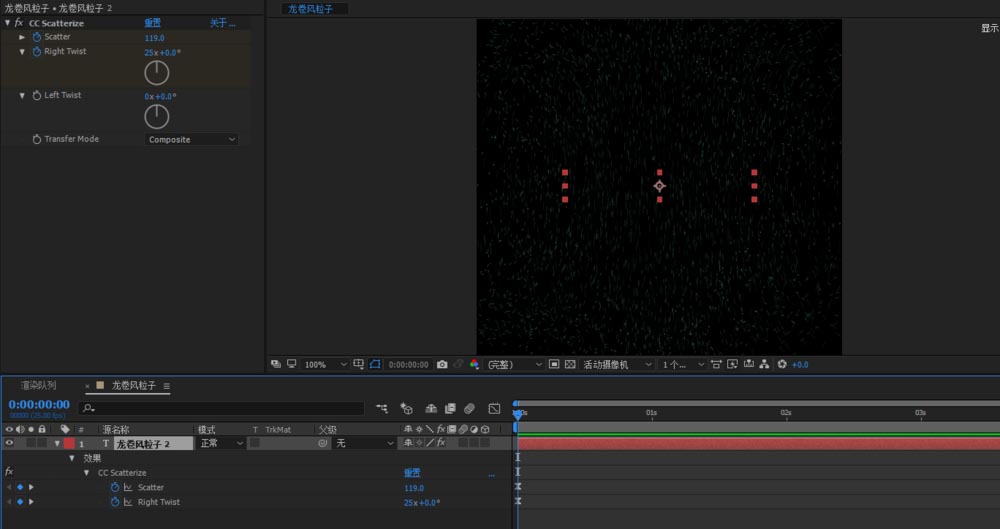 4、给Scatter,Righ Twist,K关键帧实现动效;开始的时候通过调整Scatter粒子铺满整个画布,Righ Twist开始为25x来控制旋转的参数;下一帧,恢复完整字体Scatter为0,Righ Twist为0;