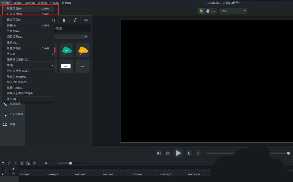 1、打开Camtasia 9软件,进入到软件界面,执行文件新建一个项目。
