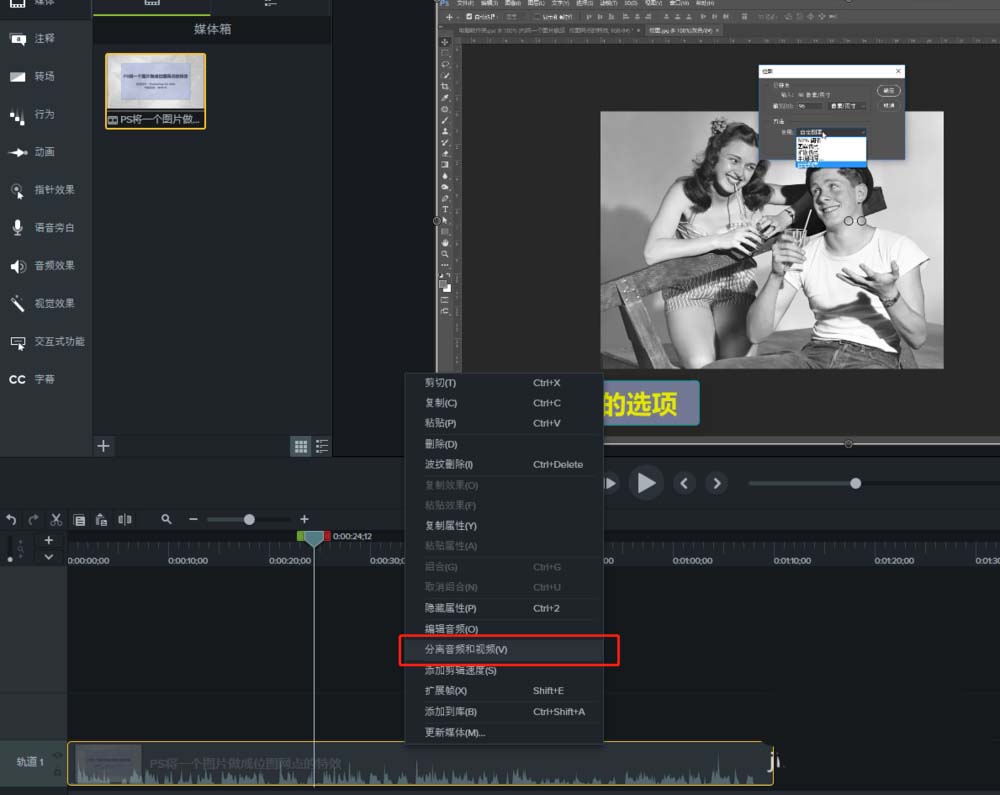 4、单击选中时间轴的视频文件,右键鼠标,找到并执行分离音频与视频。