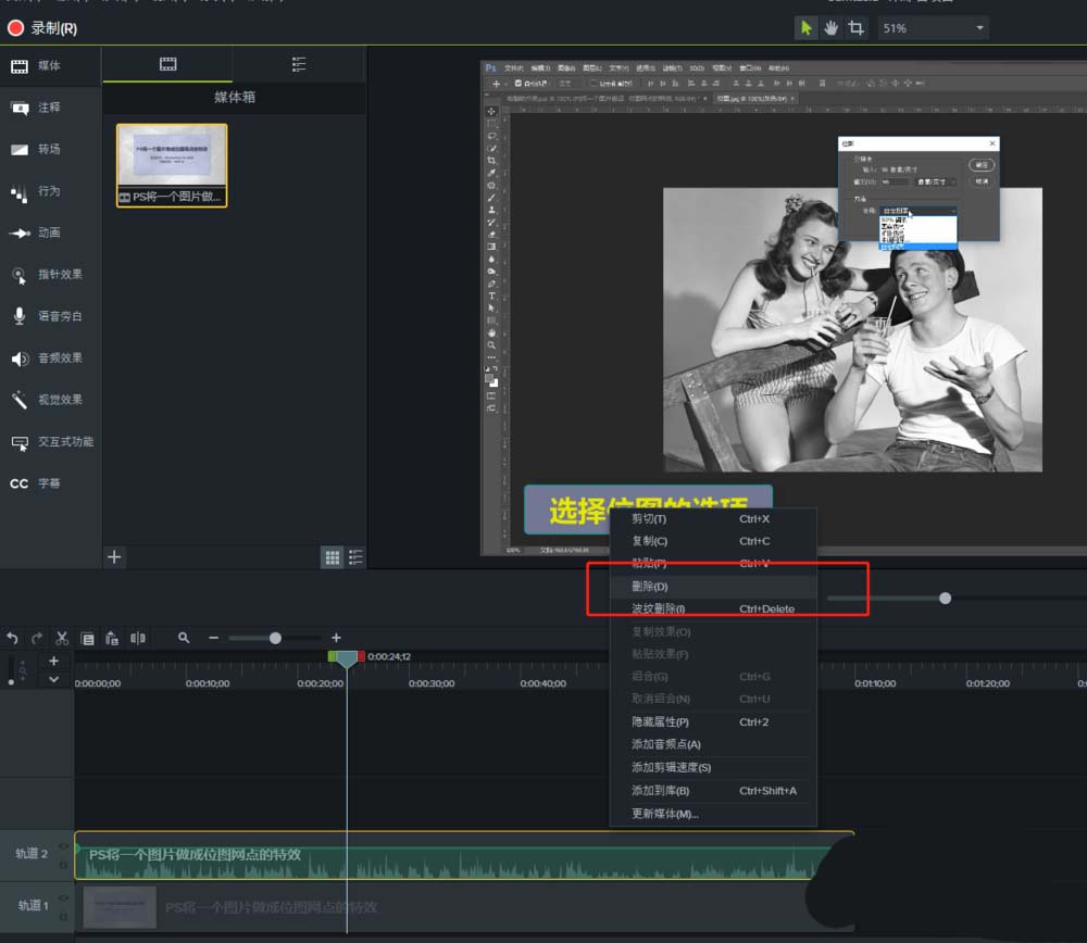 5、在单独单击选中分离后的音频文件,右键鼠标执行删除这个命令选项。