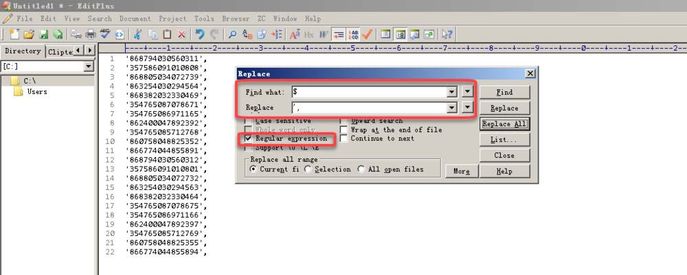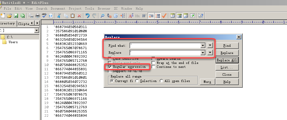3、将SQL用到的选项文字复制到EditPlus,此时用快捷键【CTRL+H】打开【Replace】窗口,在该窗口中【Find what】后面的框框中输入【^】,在【Replace】后面的框框中输入【'】,并将下方的【Regular expression】选项勾上并点击【Replace All】按钮。此时每一行文本前都加上了单引号。