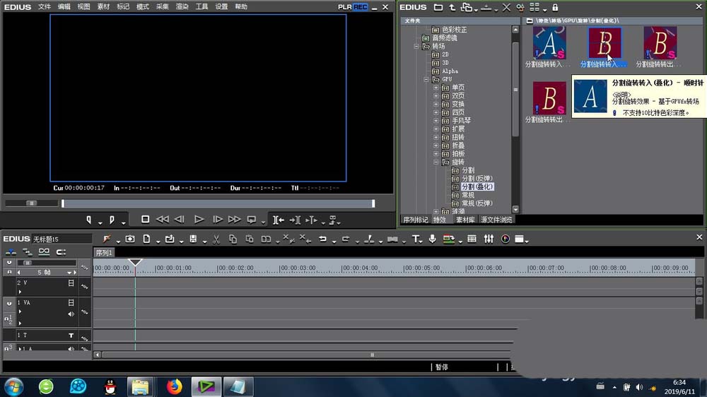 1、首先就是“分割叠化旋转”的位置是在特效里面的-转场-GPU-旋转-里面,里面有几种类似的效果(大同小异)供我们挑选使用